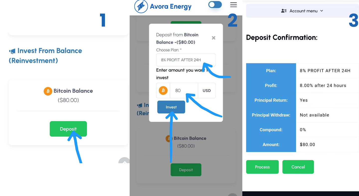 ReinvestmentYou will need to reinvest from your current account balance after you have made your profit from your initial deposit if you are not ready to make a new deposit, when you are logged into your account, click on invest.