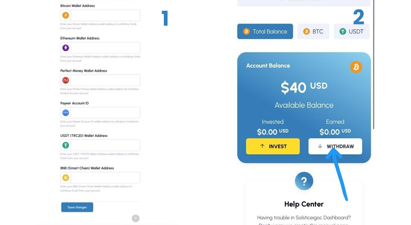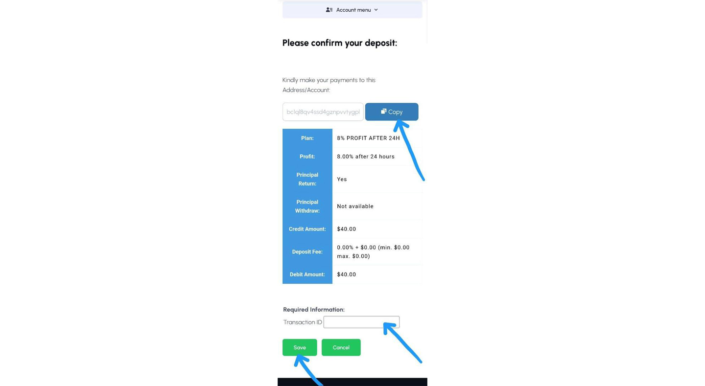 DepositsIt’s now time for you to copy the wallet address provided to you for the investment,then go to deposit the funds from your wallet,after you have deposited the funds copy the transaction ID and paste it in the space for transaction ID then click on save to save your deposit and the administration will create your deposit as soon as they receive the funds.