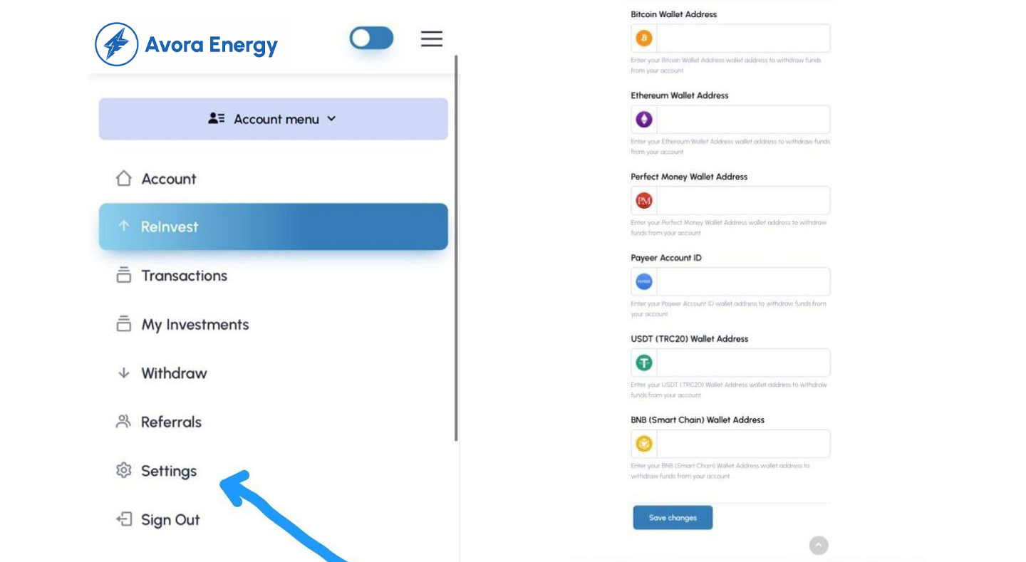 After that,click on settings to put the wallet address you want to be using for the transaction (put your active wallet address because the administrator will send the funds there,if you make a mistake in your wallet there will be no compassion).